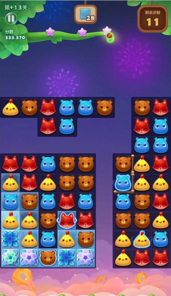 隐藏关卡13关的核心目标是30步内消除108个冰砖,关键在于优先使用道具组合和特效消除。开局需快速消除蓝色礼物盒获取小木锤道具,并利用魔力鸟与直线特效交换来破除右侧雪块。冰块集中在右上角和中间区域,需分阶段处理,前10步重点打通动物掉落通道