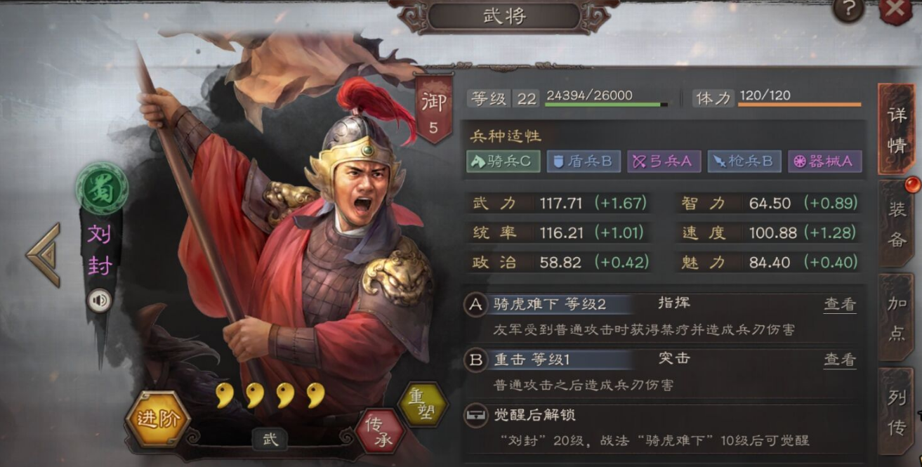 刘封在三国志战略版中定位为功能性输出武将,其核心价值在于自带战法骑虎难下。该战法为指挥类型,当友军受到普通攻击时,有概率触发双重效果:对受击友军施加当回合禁疗状态,同时对敌军群体两人发动兵刃伤害。这一机制决定了刘封的兵书选择需围绕强化输出效
