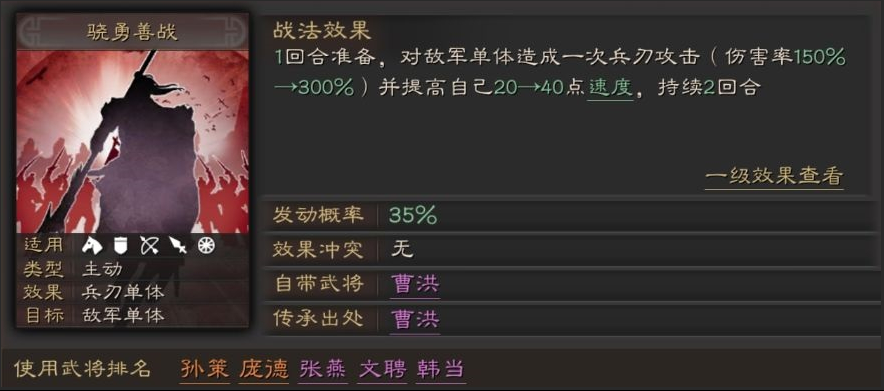 骁勇善战是 一项A级单体伤害类战法,其核心获取方式为传承特定武将。该战法在战斗中具备明确的战术价值,主要针对敌军单体目标发动强力兵刃攻击,并在命中后为施法者提供速度增益效果。其伤害机制属于准备型战法,需经过一回合准备方能释放,对敌方造成显著