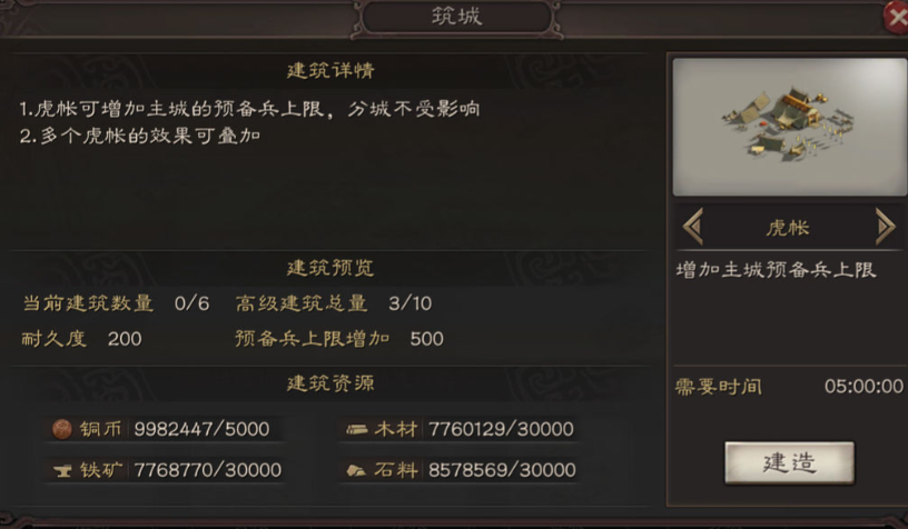 关于虎帐的战略定位,其核心价值体现在兵员储备层面。1级虎帐提供500预备兵容量,满级5级可提升至2500容量,多个虎帐的效果可叠加生效。在高强度对抗中,充足的预备兵能显著缩短部队恢复周期,尤其在拉锯战或多线作战时,可避免因兵力枯竭导致的战力