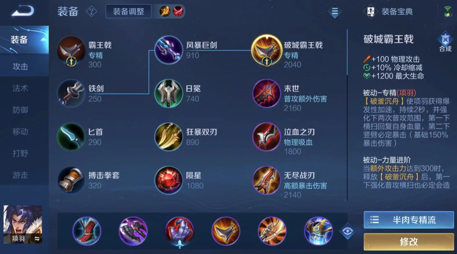 其出装需围绕专精装备构建核心体系,同时根据战局需求灵活调整防御与攻击属性的平衡。破城霸王戟作为项羽的核心专精装,能显著增强二技能效果,使其获得爆发性强化普攻能力,该装备提供的攻击力、冷却缩减及血量加成是支撑项羽战场表现的基础。实战中需注意专