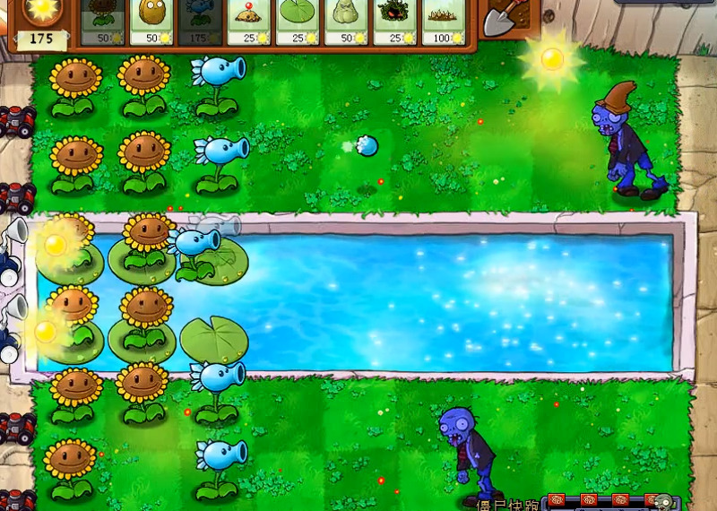 在挑战僵尸快跑关卡时,会发现整个节奏比普通模式快得多,僵尸移动速度和植物冷却都大幅提升,阳光掉落也更快了。咱们得把向日葵种够,阳光是生存的基础,建议至少种两排双子向日葵,水路和陆地都要兼顾。开局手速一定要跟上,看到僵尸露头就用窝瓜或土豆雷解