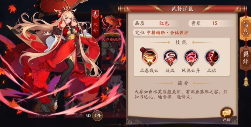 大乔的定位为中排辅助型武将,核心价值在于提供群体控制和团队增益。她的怒气技能风卷残云能对大范围敌人造成持续法术伤害并击倒目标,同时为己方物理攻击最高的单位提供显著的攻速加成,有效提升团队输出频率。普通技能旋风可将单个敌方目标吹送至后排,造成
